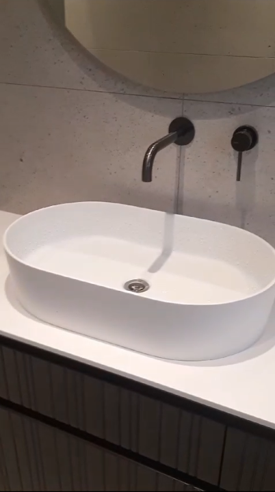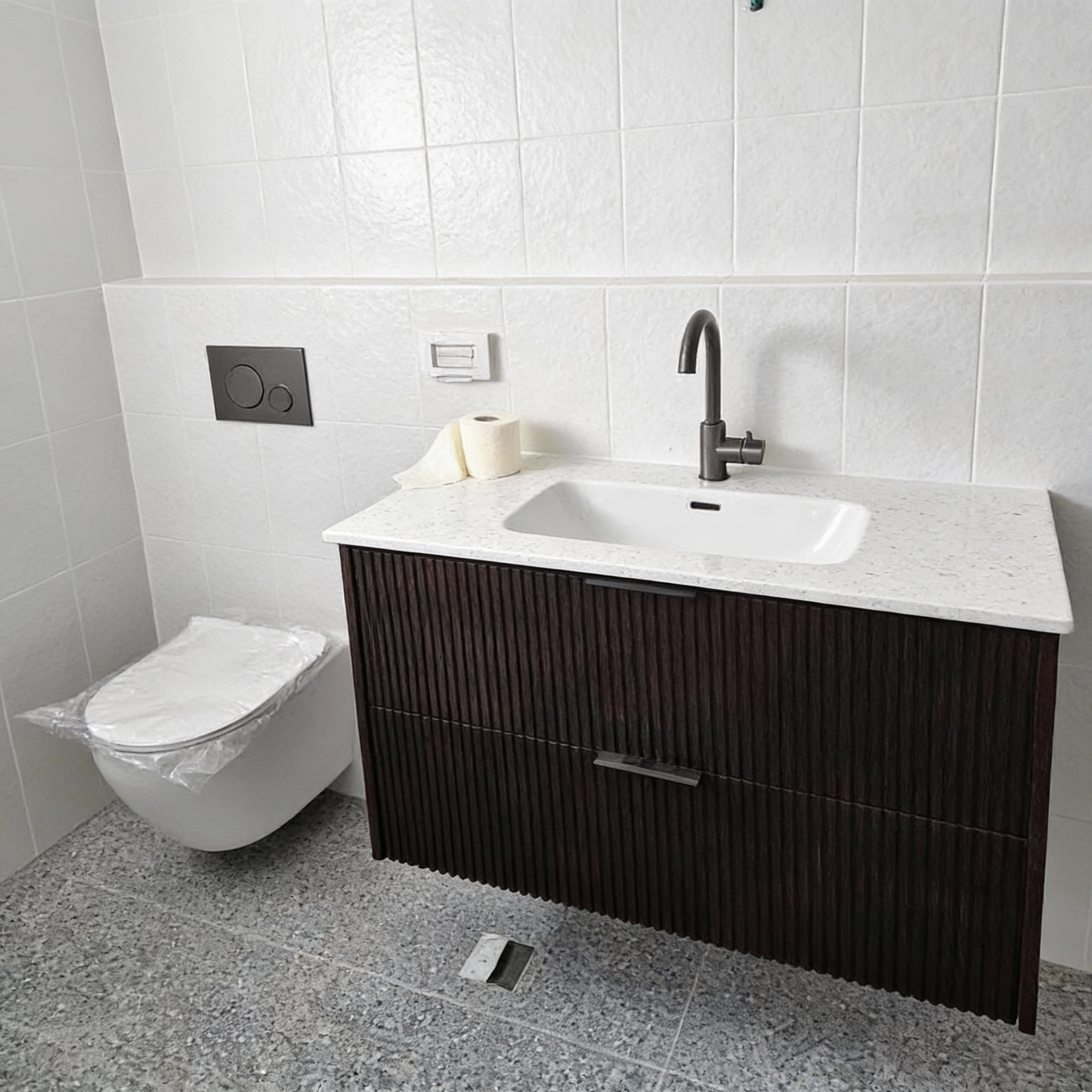 חדר רחצה שעוצב מחדש עם קווים מינימליסטיים, ריצוף טרצו וארון אמבטיה יוקרתי בגוון כהה.